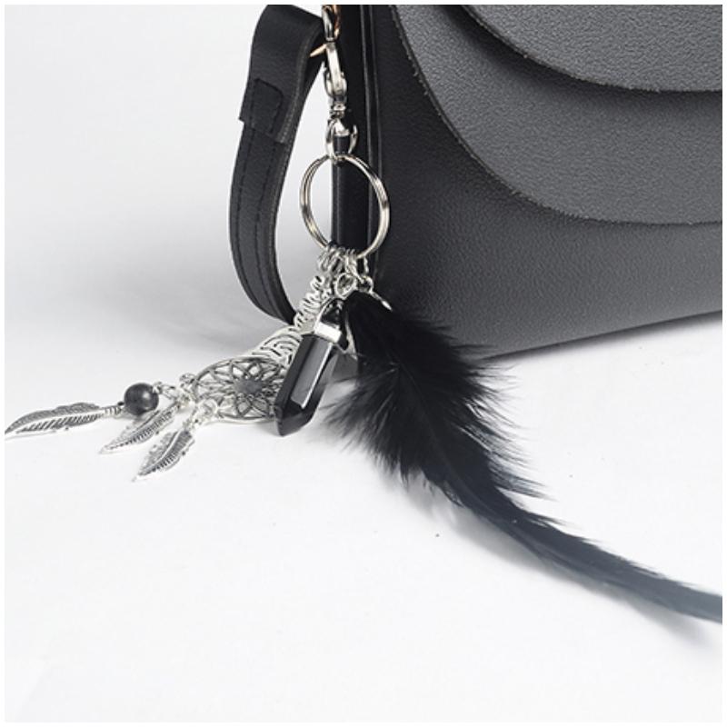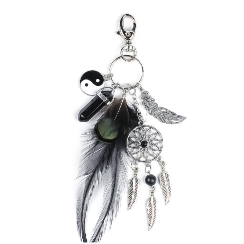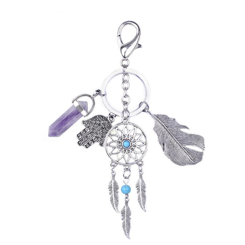 It features a Strong Stone Charm at the heart of the dream catcher plus other good luck amulets including Hamsa hand, feather & feather amulet.