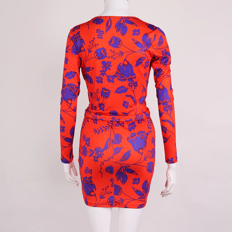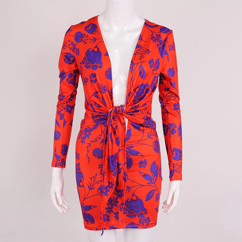 With its vibrant red color, comfortable fit, and fashionable tie-up, there is no wonder why so many ladies are loving our Printed Deep V Neck Tie-Up Long Sleeve Bodycon Dress!
