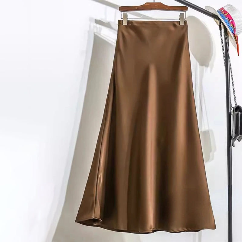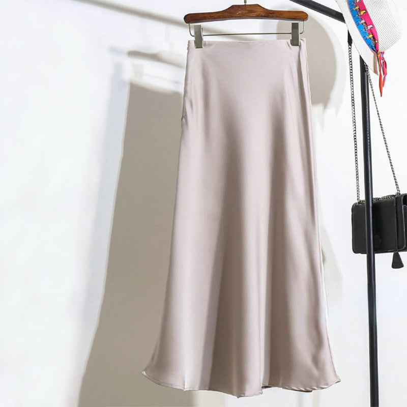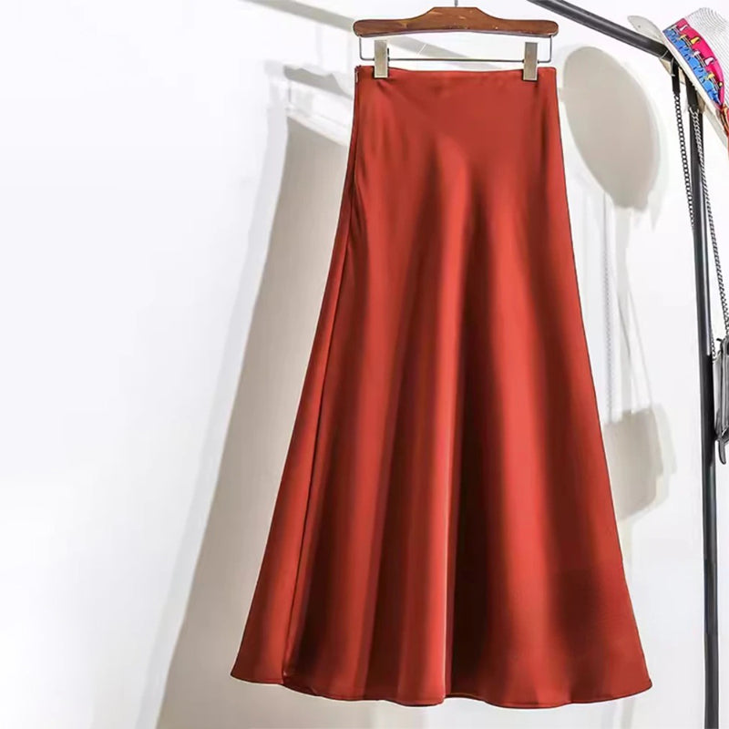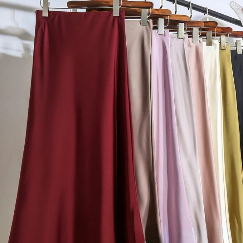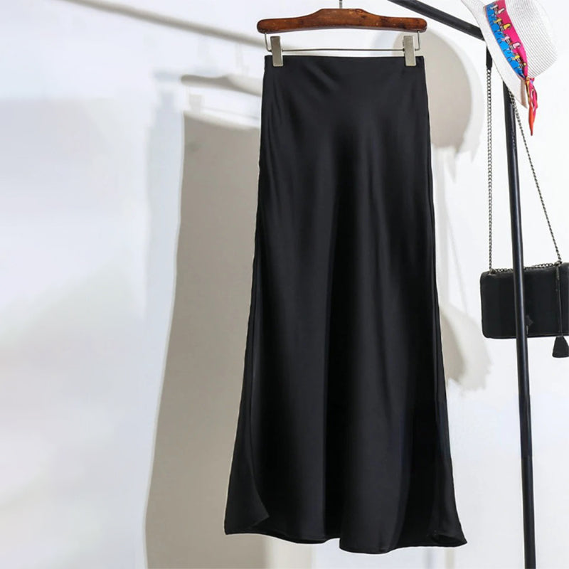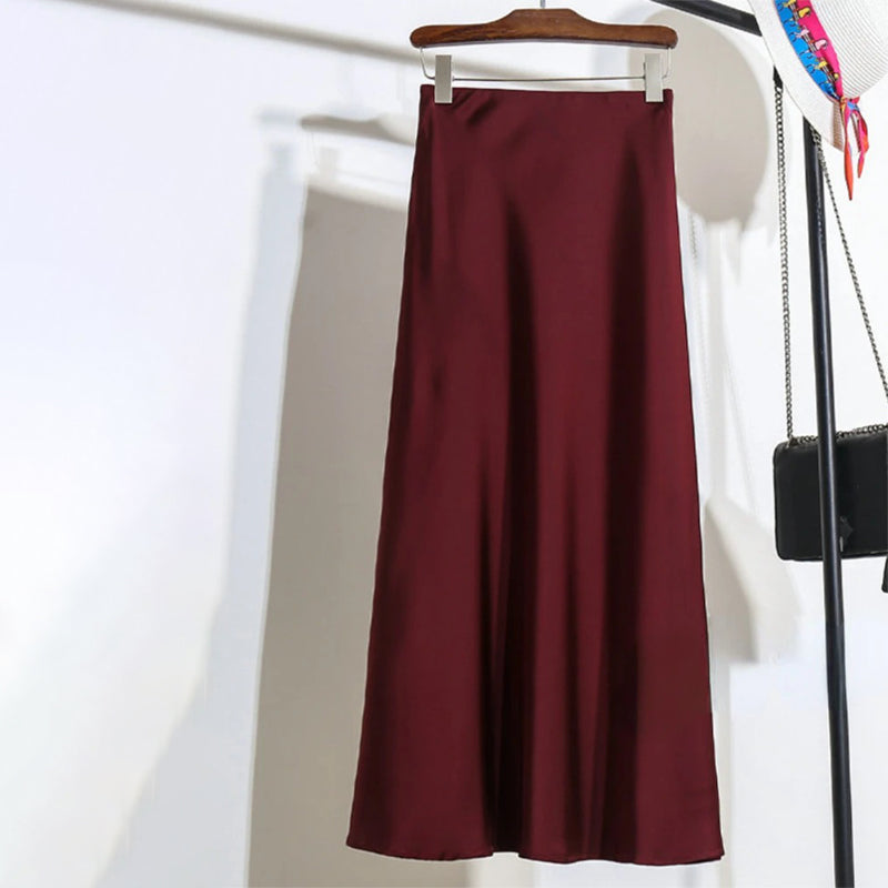 The shimmering satin fabric drapes like a dream, while the innovative stretch waistband offers a perfect fit that moves with you—no fuss, just fabulous. Designed to elevate your look and amplify your confidence, this skirt is your new go-to for making bold, effortless statements.