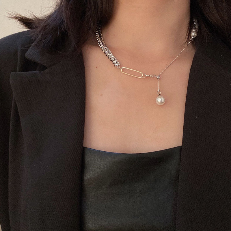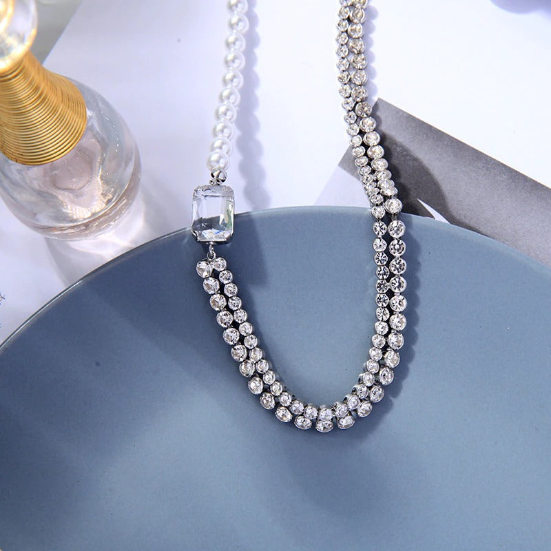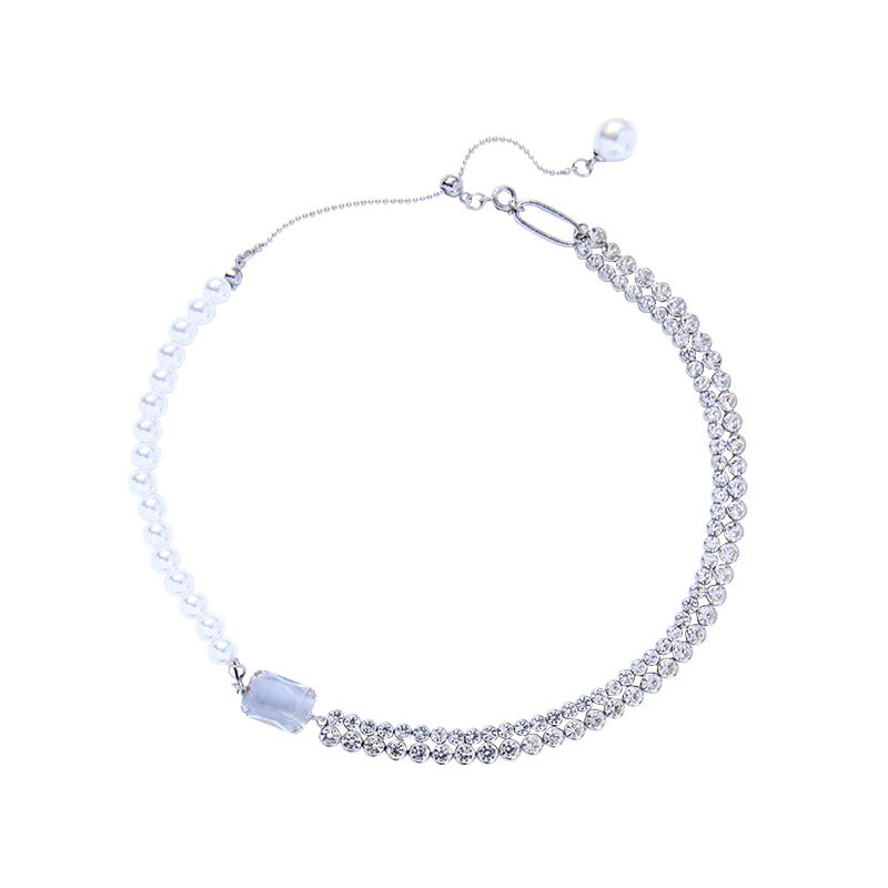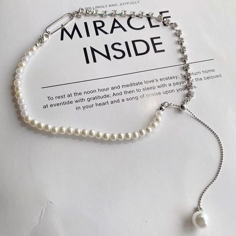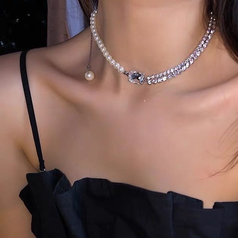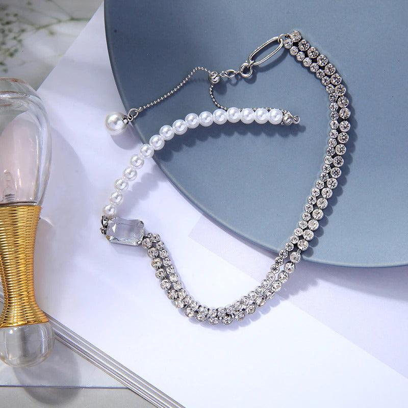 Lustrous Asymmetric Rhinestone and Pearl Choker Necklaces