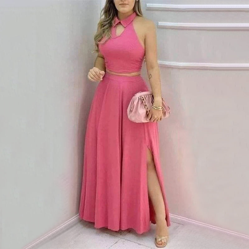 2-Piece Women's Pink Halter Collar Crop Top and Split Maxi Skirt Set