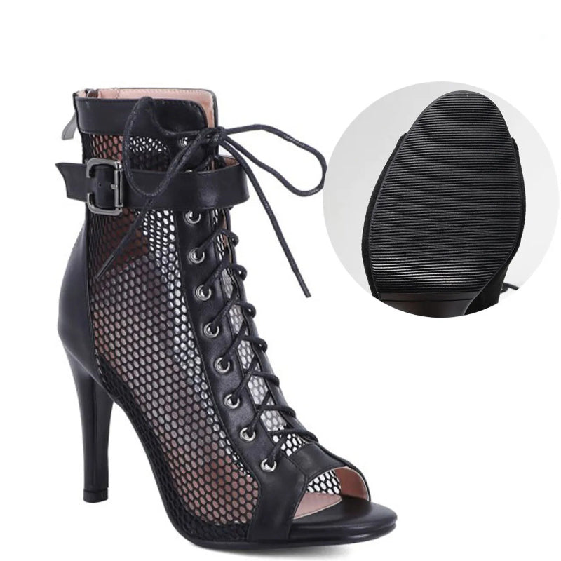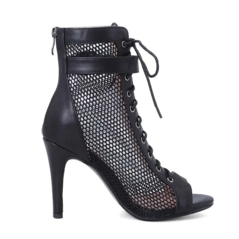 Step into the spotlight with our Sleek Lace-up Front Stiletto High Heel Mesh Boots!