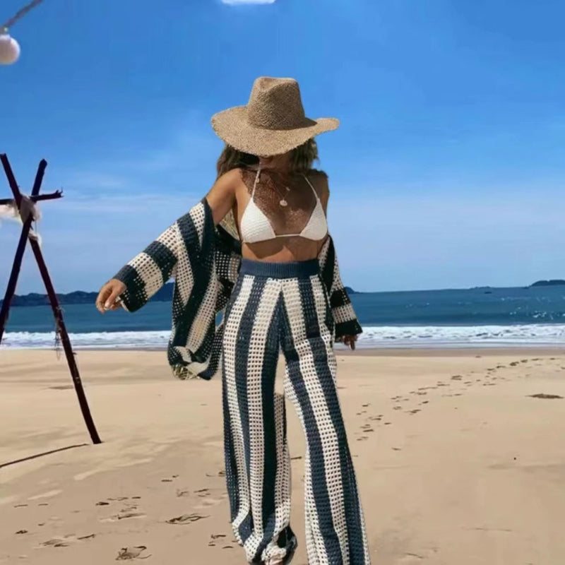 Summer-worthy Hollow Out Striped Button Top and Wide Leg Pants Set