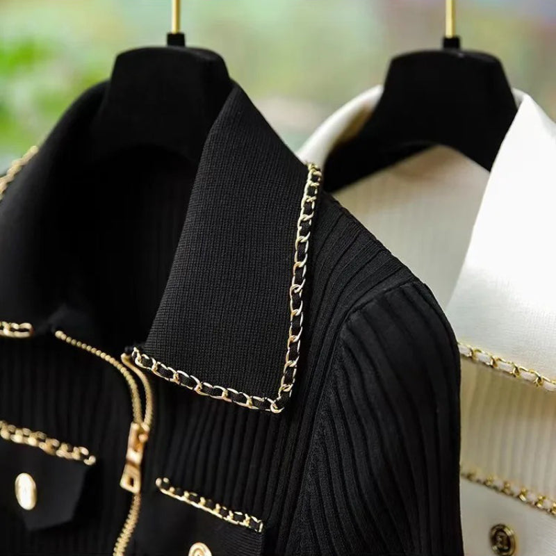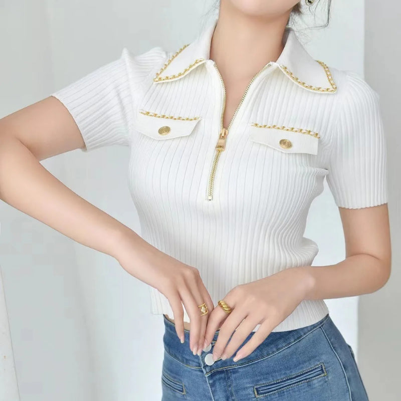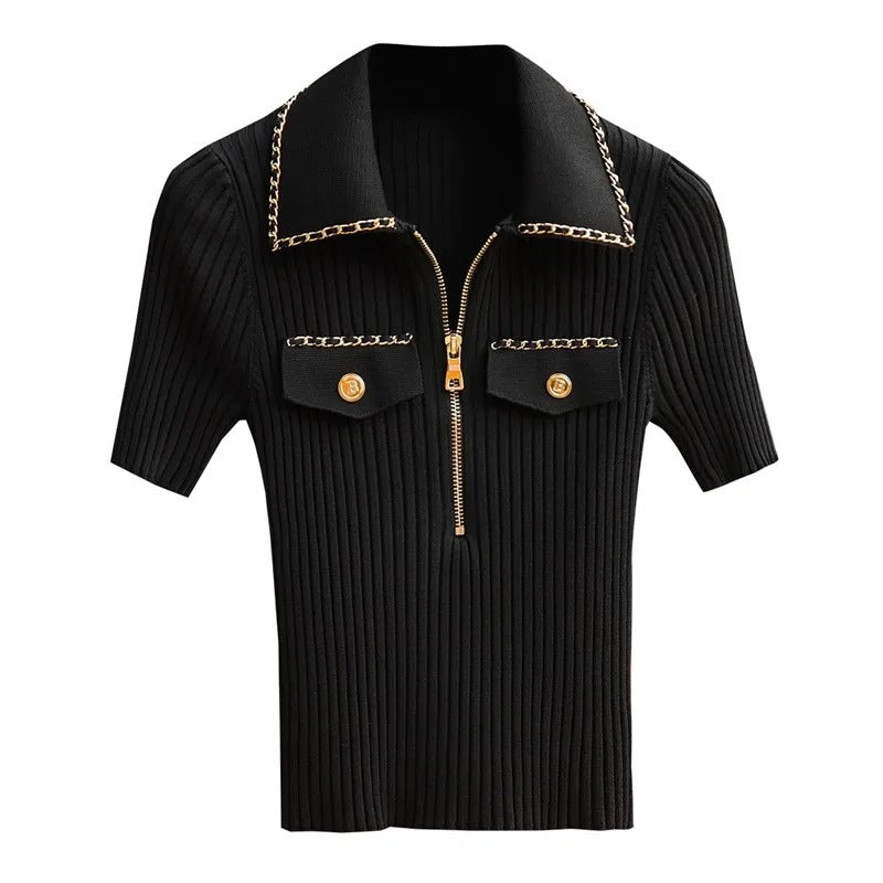 Meet the Chic Women's Slim Ribbed Knit Zip-up Top with Chain Detailing! Want a piece that seamlessly blends edgy elegance with everyday comfort?