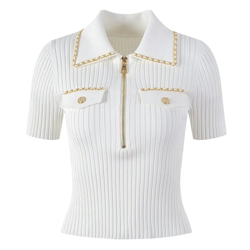 Women's Slim Ribbed Knit Zip-up Tops with Chain Detailing