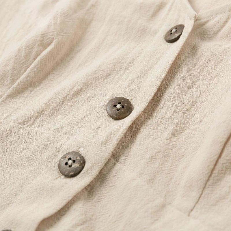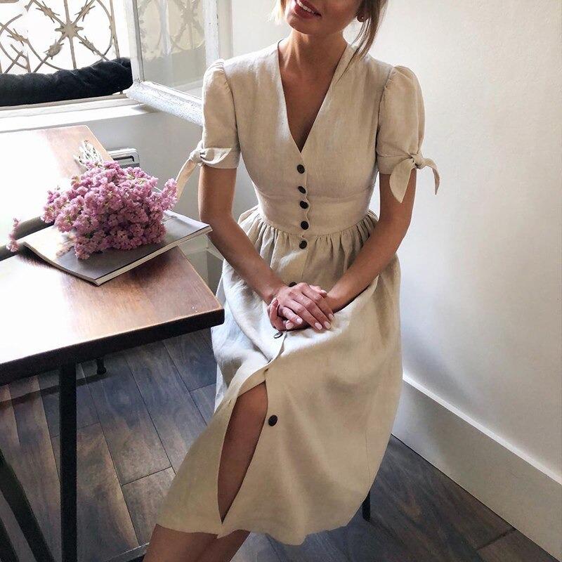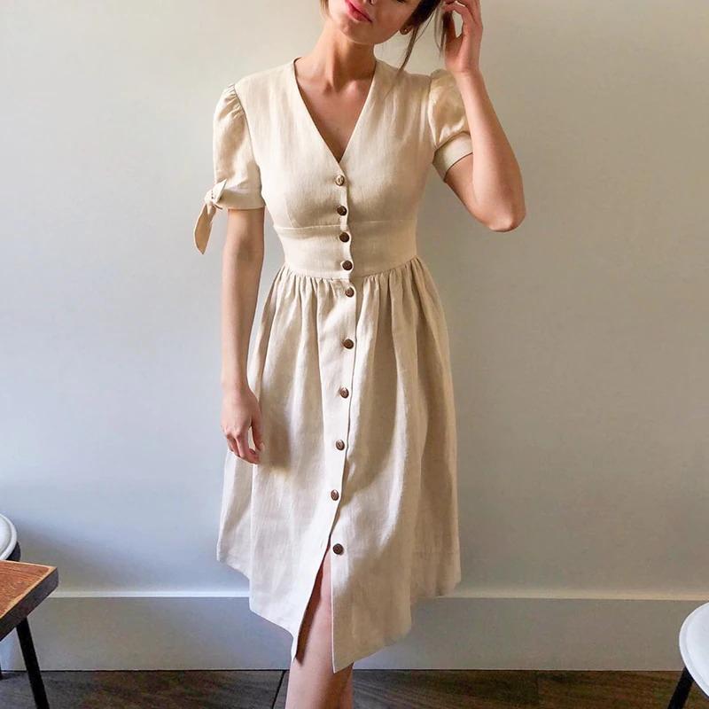 Sophisticated V-neck Button Up Puff Sleeve Dress