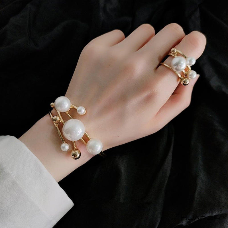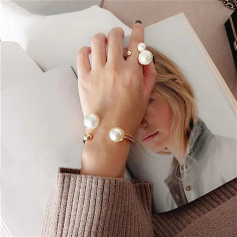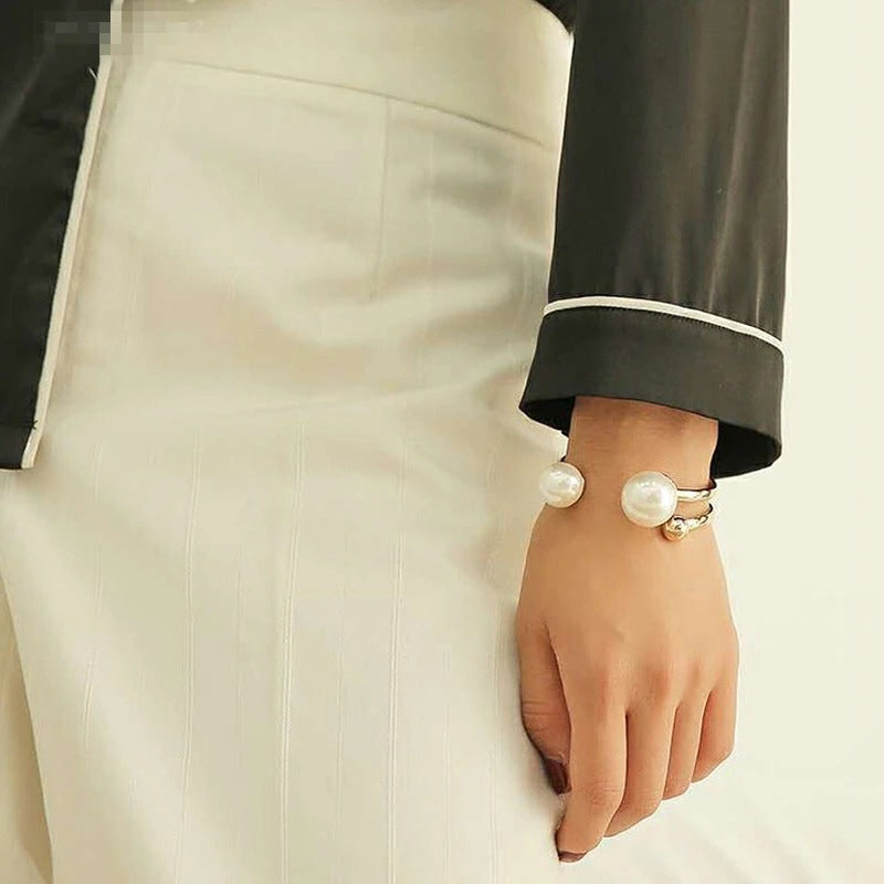 Pearls are always a woman's go-to accessory! Grab a bunch of these Geometric Posh Large Pearl Double Layer Hollow Out Bangle Bracelets!