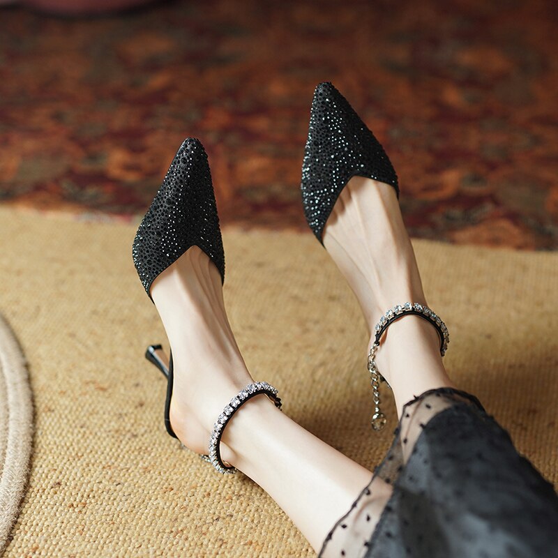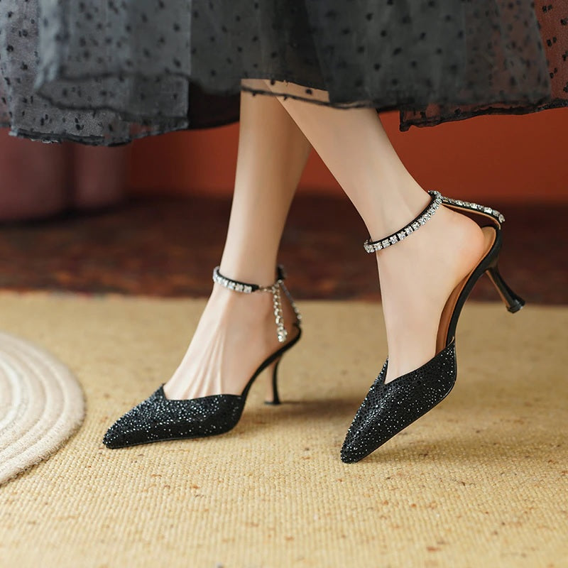 Rhinestone Embellished Pointed Toe Heels with Adjustable Ankle Strap