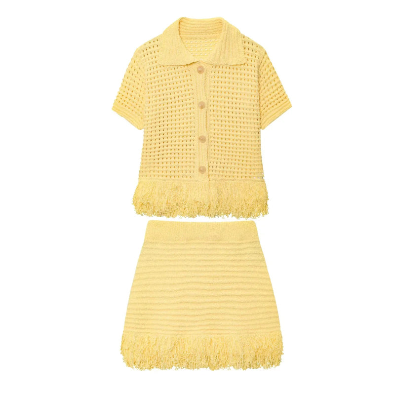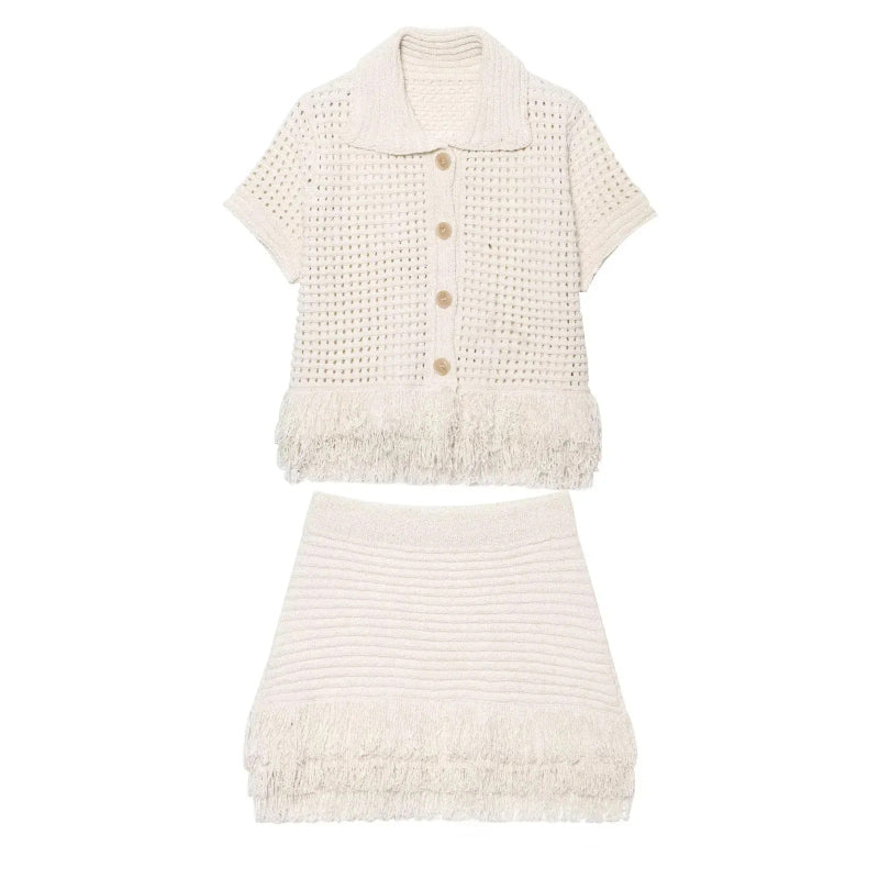 Unleash your style with our one-of-a-kind Fringed Knit Short-sleeve Top and Skirt Matching Set!