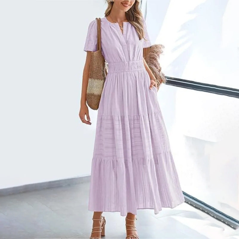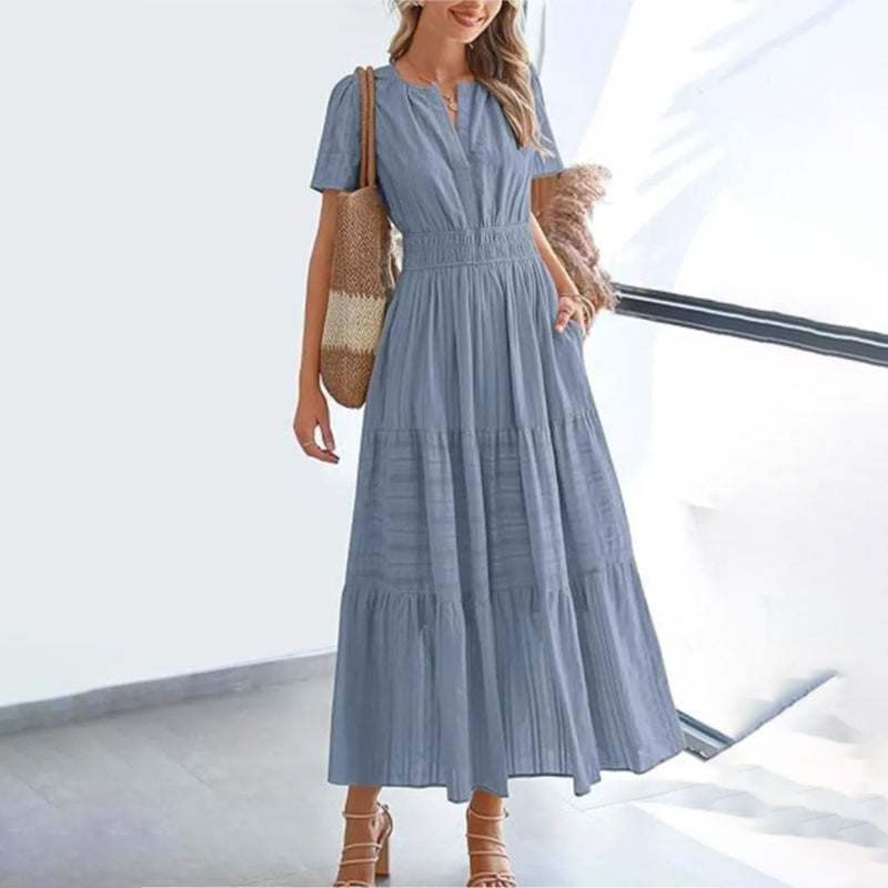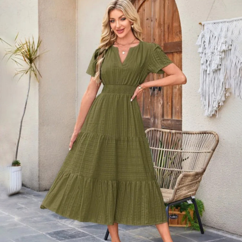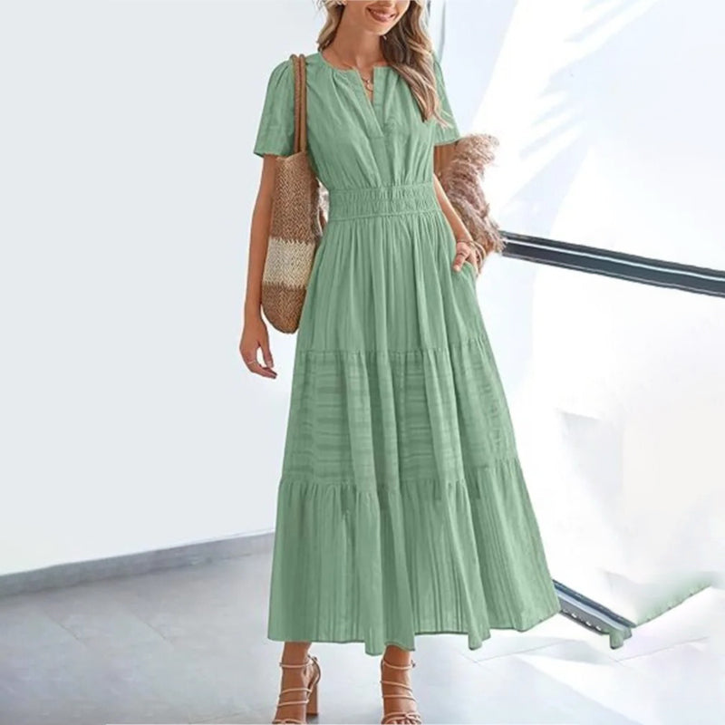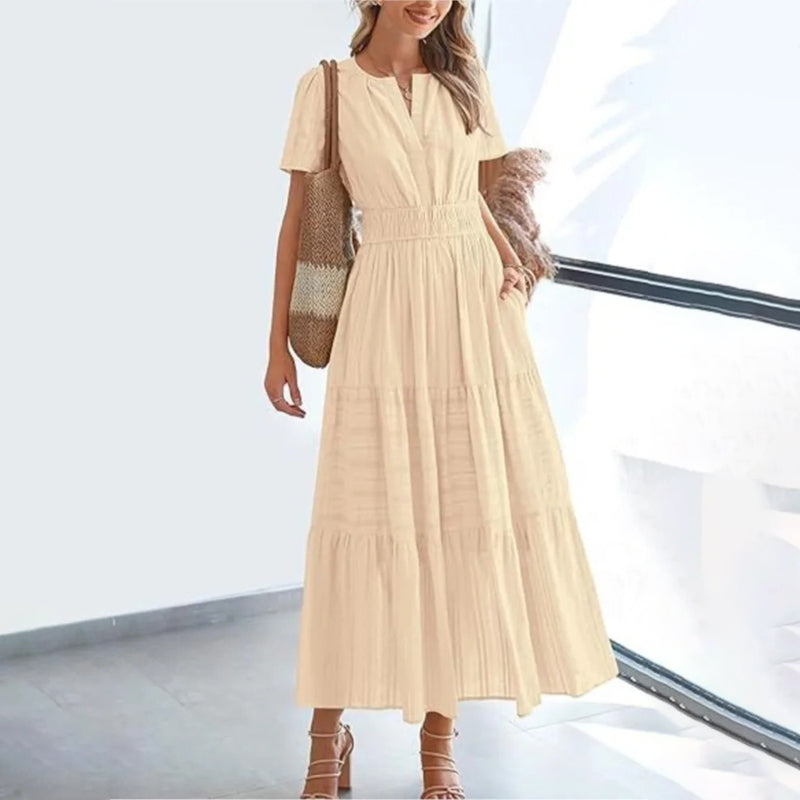 Upgrade your summer wardrobe with our stylish and comfortable Summer Casual Short Sleeve Swing Dress with Elastic Waist.