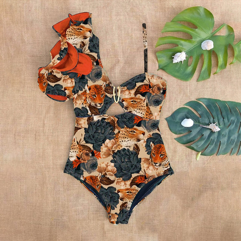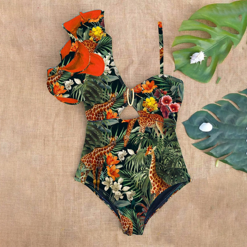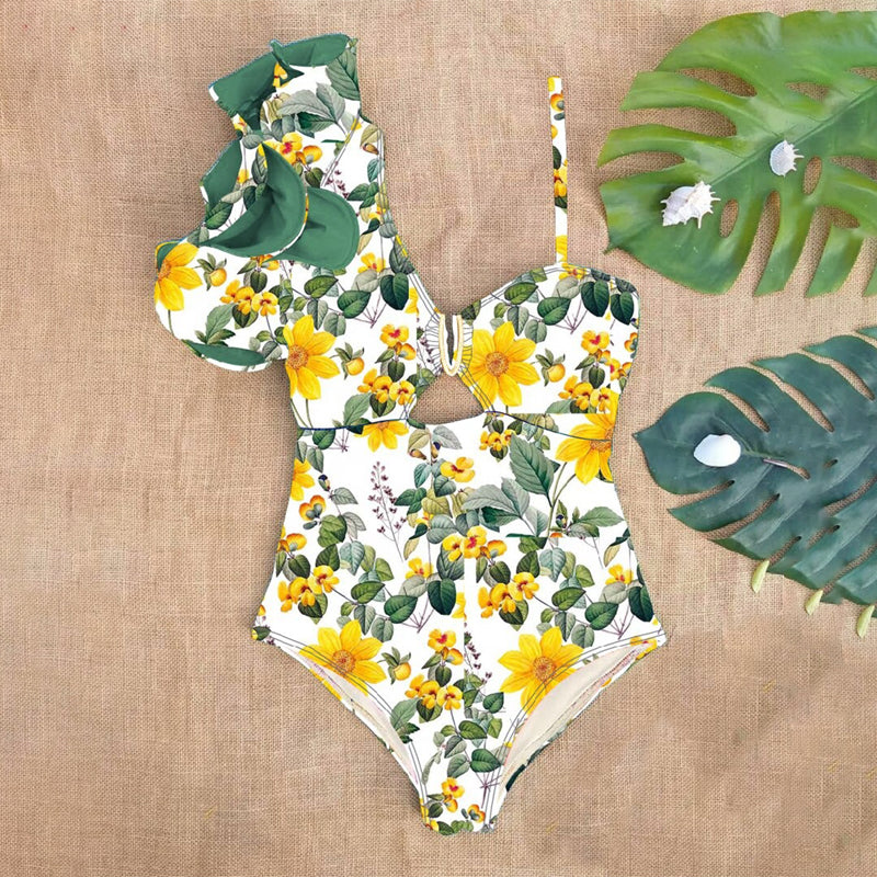 Picture this: you're strolling along the beach, and heads turn as you make your way to the water's edge. Our Gorgeous Floral Print Ruffled One Shoulder Swimsuit commands attention, turning you into a walking work of art!