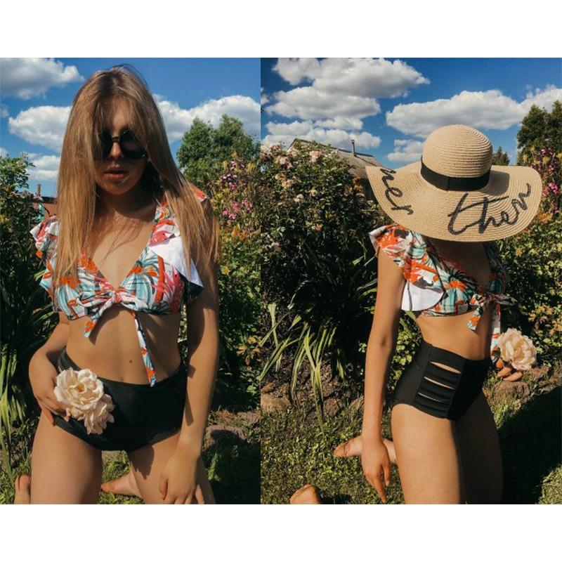 High Waist Tropical Print Ruffle Bikini Swimwear
