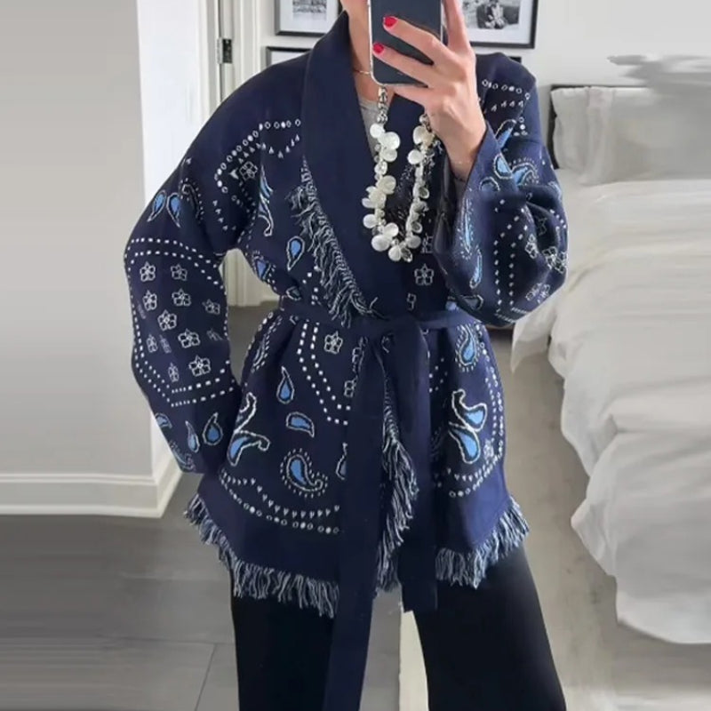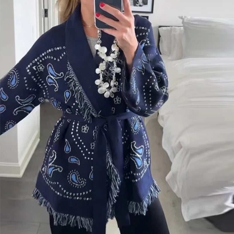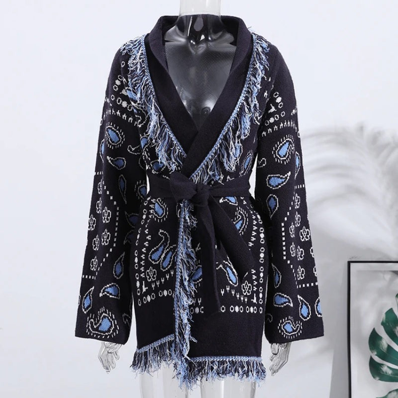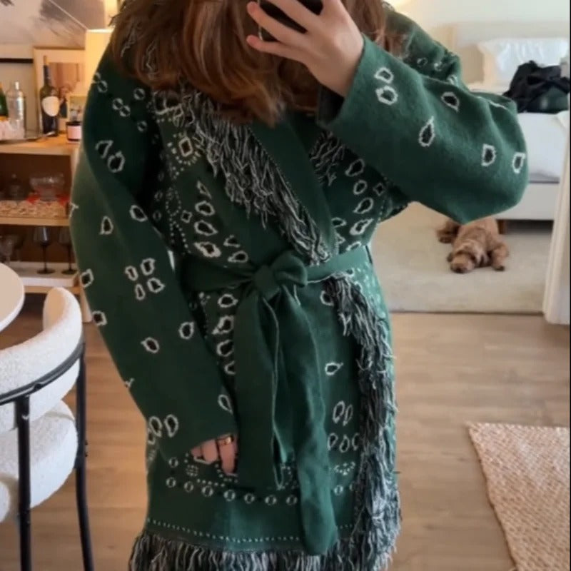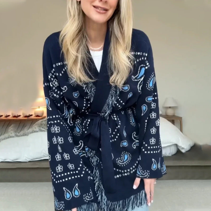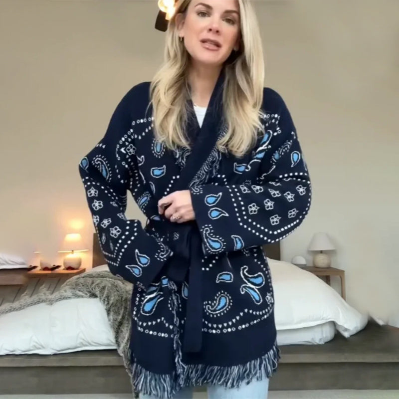 Embrace your free spirit with our Women's Boho-style Paisley Pattern Knitted Fringed Cardigan!