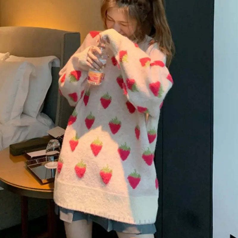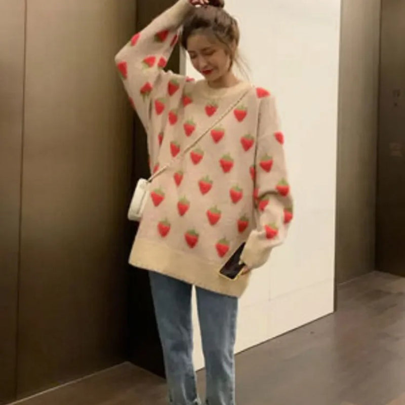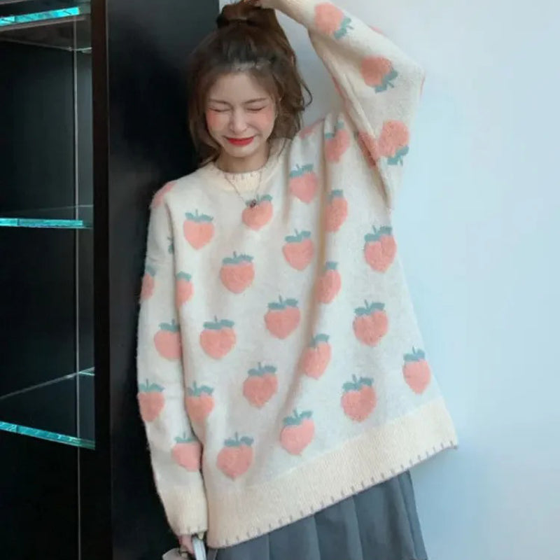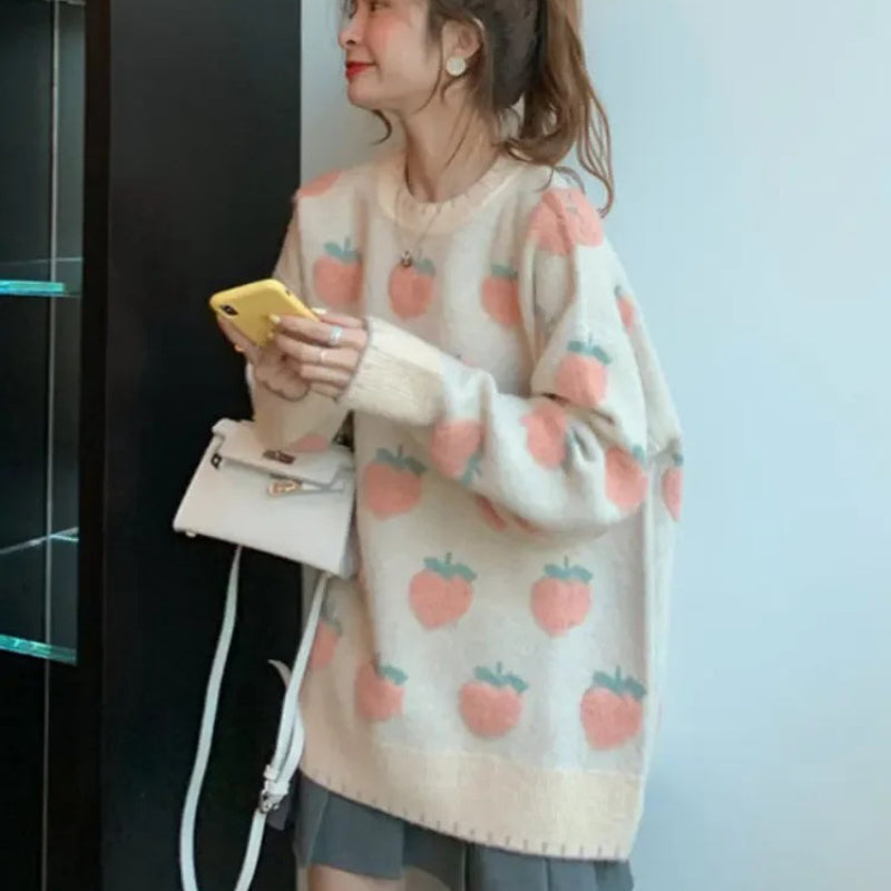 Cute and Cozy O-Neck Sweater with Strawberry and Peach Fruit Pattern