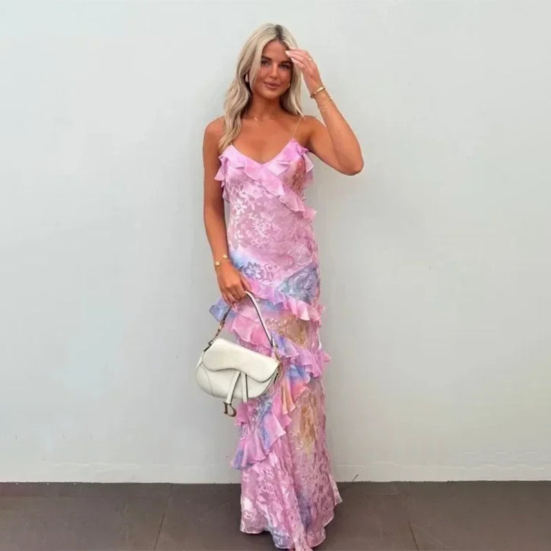 Step into the spotlight with our stunning Spliced Ruffle Spaghetti Strap Backless Long Dress with Flounced Edges!