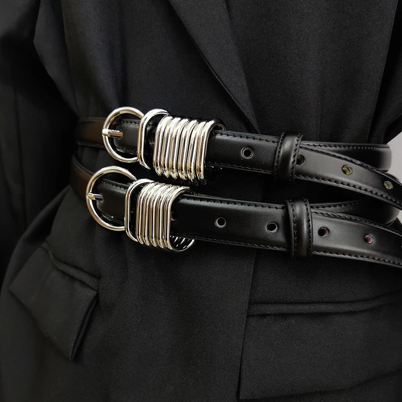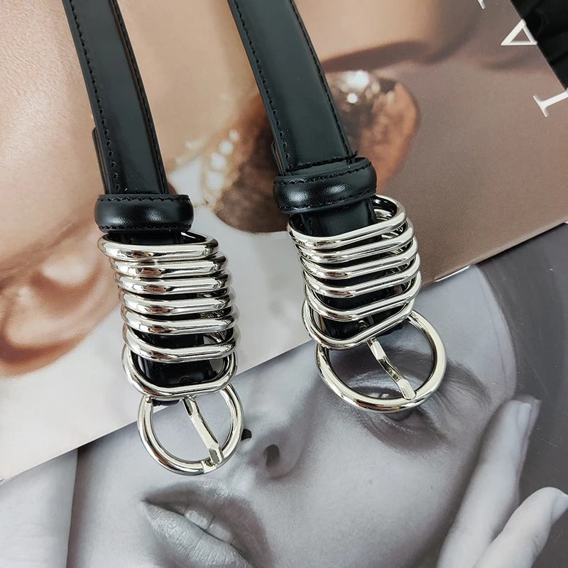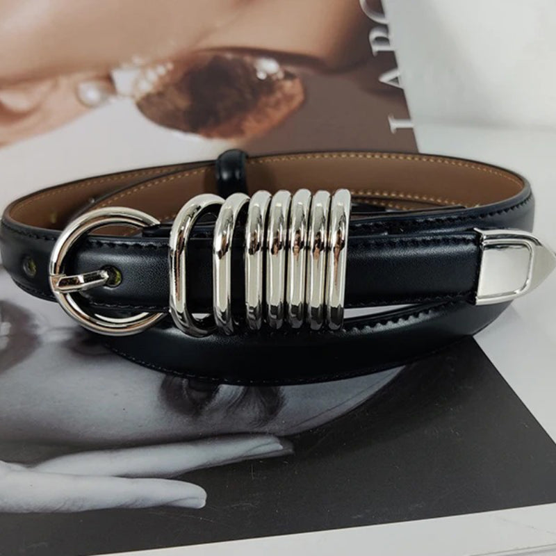 This standout accessory is designed to add a touch of sophistication and edge to any outfit. Featuring bold silver-toned metal rings against sleek black faux leather, it effortlessly combines fashion and function. Whether dressing up or down, this belt is your go-to for making a memorable style statement.