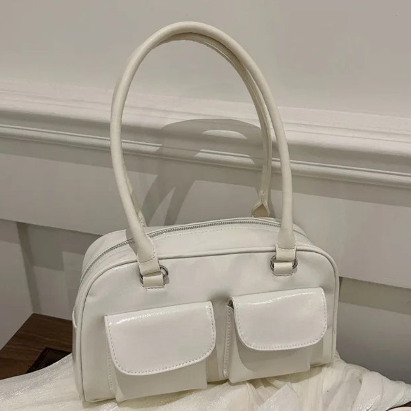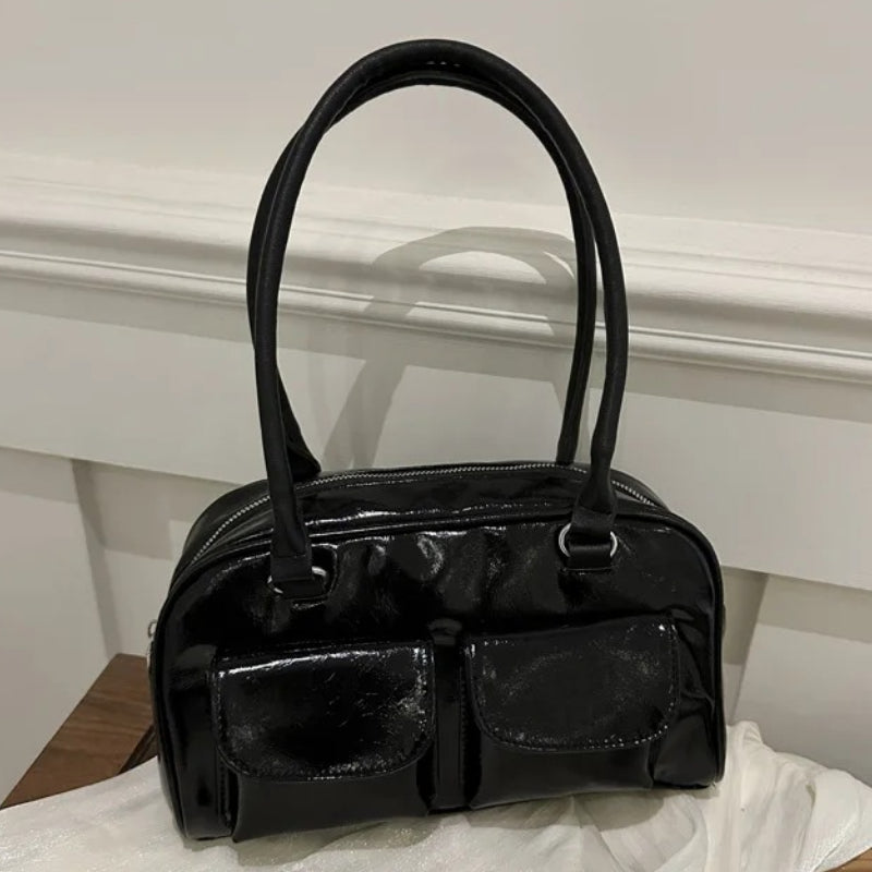 Trendy Women's Glossy Shoulder Bag with Front Pockets