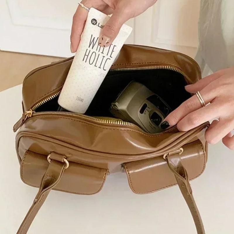 This chic bag is designed to turn heads and keep your essentials organized effortlessly. Its glossy finish adds a touch of glamour, while the front pockets provide easy access to your must-haves.